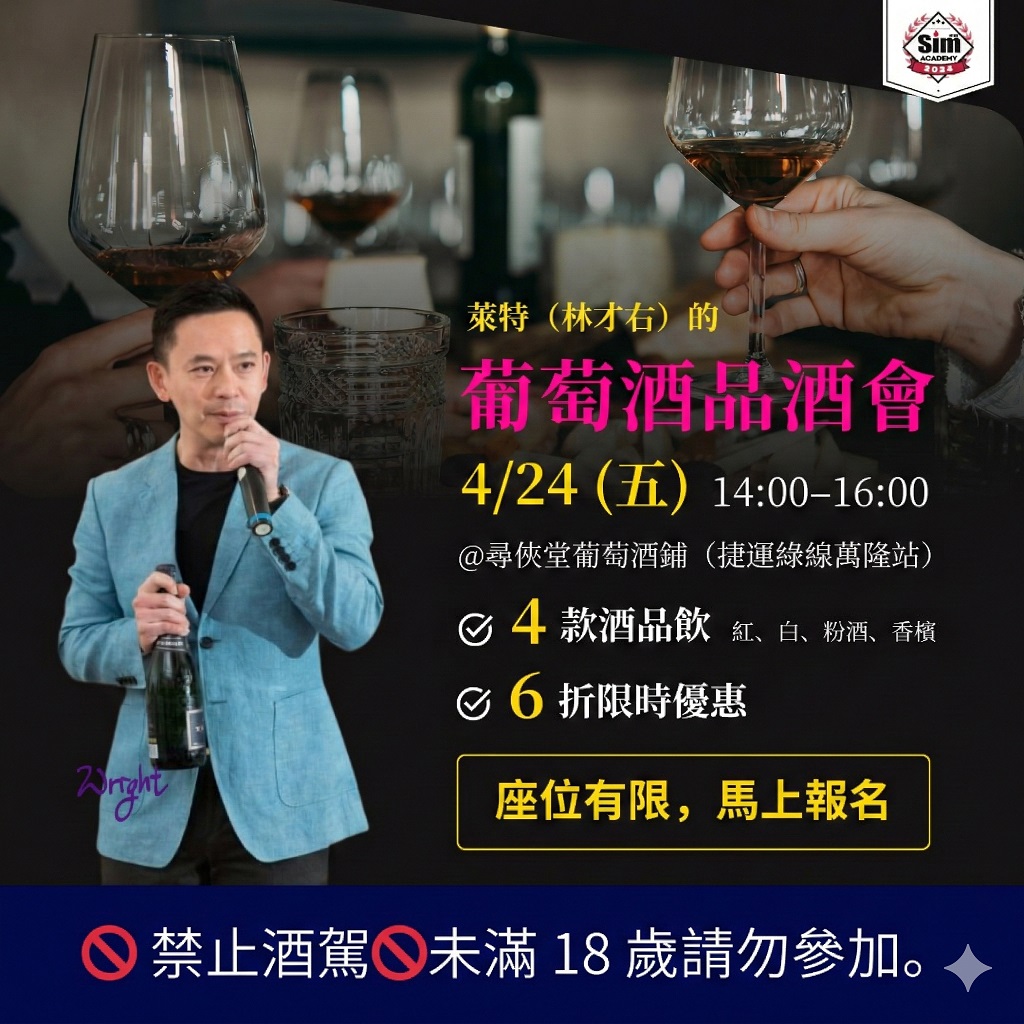 香檳大師萊特 × 尋俠堂葡萄酒鋪 × 高質感包場 × 紅/白/粉/香檳 4 款酒|限量席次